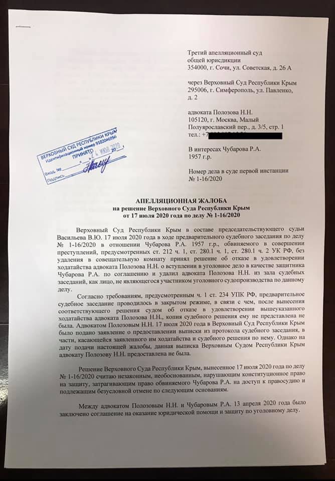 «Сьогодні Верховний суд Криму надав мені виписку з протоколу попереднього слухання, де відображена постанова суду про відмову в допуску мене до здійснення захисту Рефата Чубарова на стадії судового розгляду. Це був останній відсутній документ, що перешкоджає подачі скарги на цю постанову в апеляційну інстанцію — Третій апеляційний суд загальної юрисдикції. Оскільки всі перешкоди усунені, цю апеляційну скаргу я відразу ж подав. Тепер подивимося, наскільки сочинські судді апеляційної інстанції прихильні дотриманню норм закону. У Криму, на жаль, з цим дуже і дуже погано», — наголосив Полозов.