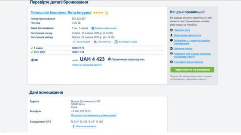 European website Booking.com offers the booking services of hotel suites in hotels in the occupied Crimea