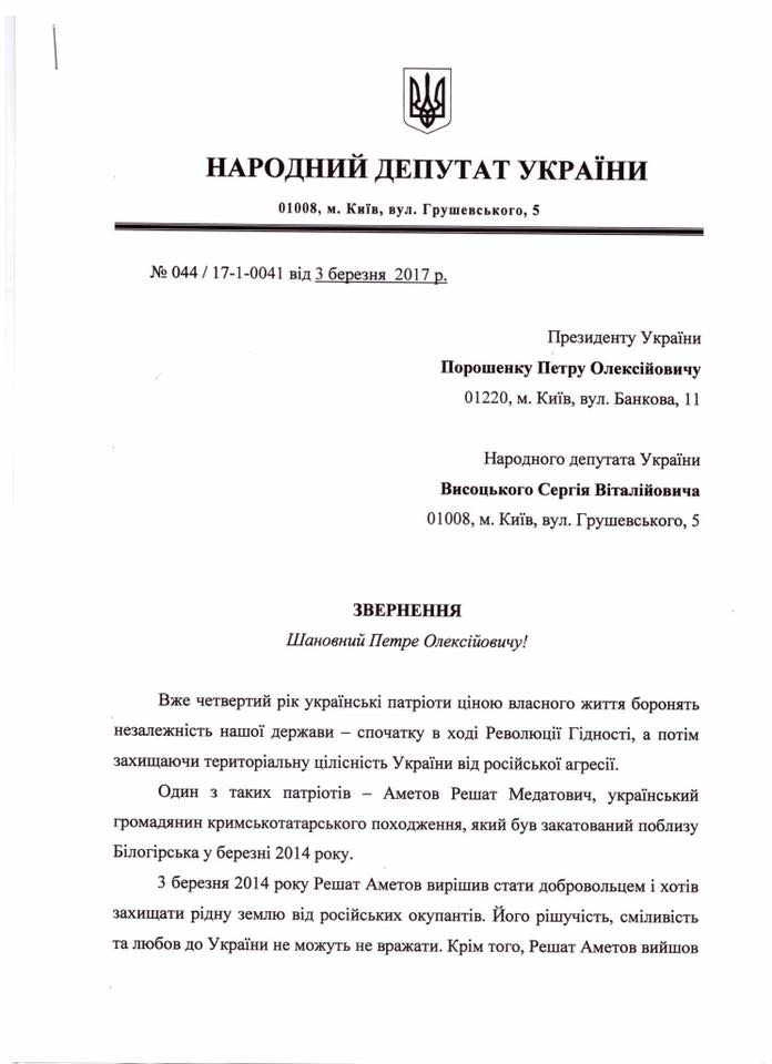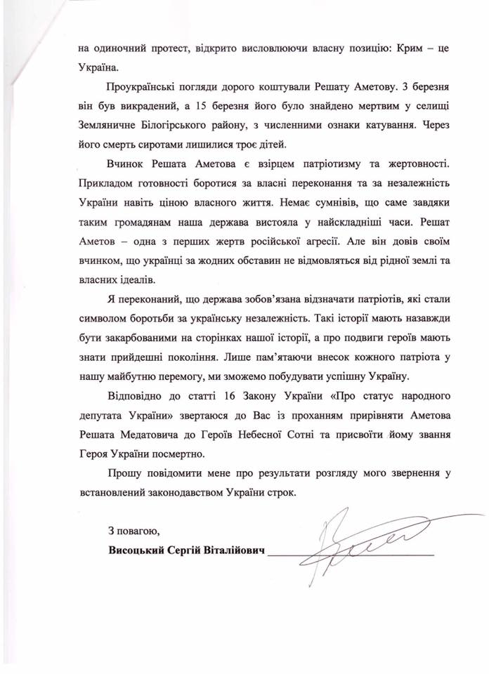 Народный депутат Сергей Высоцкий попросил президента присвоить Решату Аметову звание Героя Украины