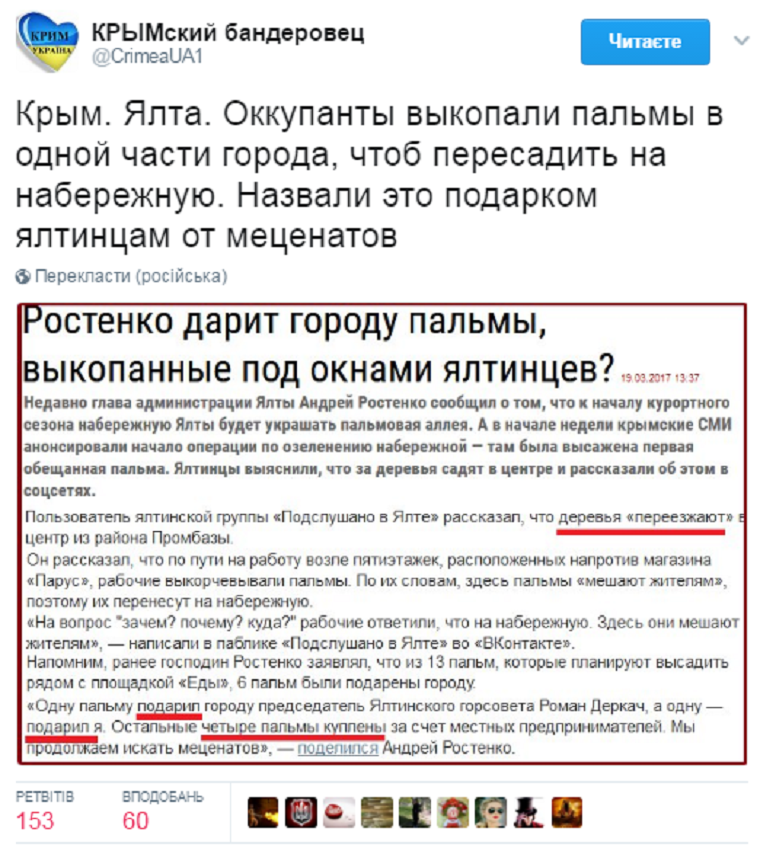 «Оккупанты в Ялте выкопали пальмы в одной части города и пересадили на набережную. Назвали это подарком ялтинцам от меценатов и даже лично от «мэра». Это трудно комментировать», − написал он.