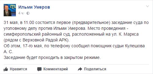 Kırım sözde Simferopol bölge «mahkemesi», 31 Mayıs saat 11:00'de, K.T.M.M. Bşk Yrd. İlmi Umerov'a karşı ceza «dava»sının ön duruşmasını ele alacak.