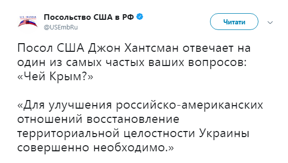 Один из пользователей соцсети Twitter спросил у Хантсмана: «Чей Крым?». Посол объяснил, что ответ на этот вопрос знает любой человек, который знаком с международным правом.