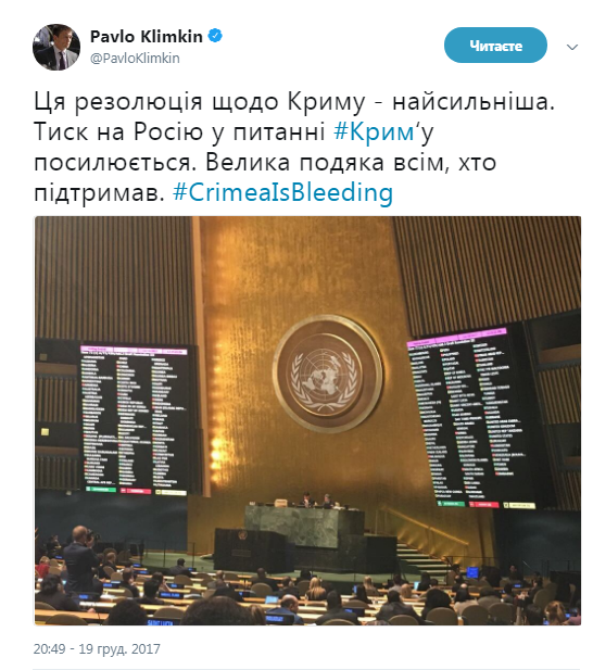 «Эта резолюция по Крыму — самая сильная. Давление на Россию в вопросе Крыма усиливается. Большое спасибо всем, кто поддержал», — написал министр на странице в Twitter.
