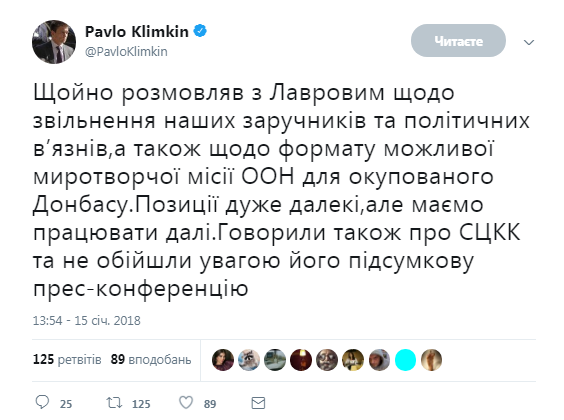 «Только что разговаривал с Лавровым об освобождении наших заложников и политических заключенных, а также о формате возможной миротворческой миссии ООН для оккупированного Донбасса. Позиции очень далеки, но должны работать дальше. Говорили также о СЦКК и не обошли вниманием его итоговую пресс-конференцию», — написал Климкин.