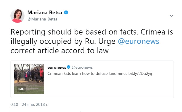 Напомним, 23 января телеканал Euronews показал сюжет о военных учениях для детей из Крыма, не упомянув о незаконной аннексии полуострова. В нем говорится об учениях для школьников Крыма младше 12 лет, которые организовал шестьдесят восьмой инженерный полк российской армии. В сюжете приводятся комментарии школьников из Евпатории, которые положительно отзываются об уроке.