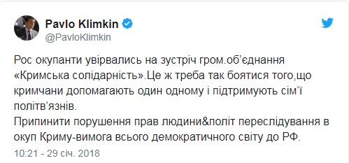 «Российские оккупанты ворвались на встречу общественного объединения «Крымская солидарность». Это как же нужно боятся того, что крымчане помогают друг другу и поддерживают семьи политических узников. Прекратить нарушение прав человека и политические преследования в оккупированном Крыму — требование всего демократического мира к России», — заявил Климкин.