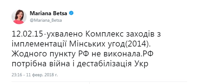«12.02.15 — принято Комплекс мер по имплементации Минских соглашений (2014 г.). Ни один пункт РФ не выполнила. РФ нужна война и дестабилизация Украины», — заявила спикер.