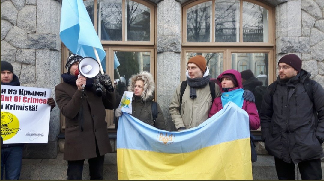 Украинцы, живущие в Финляндии, вышли с плакатами, национальными флагами Украины и крымских татар к посольству РФ в Хельсинки.