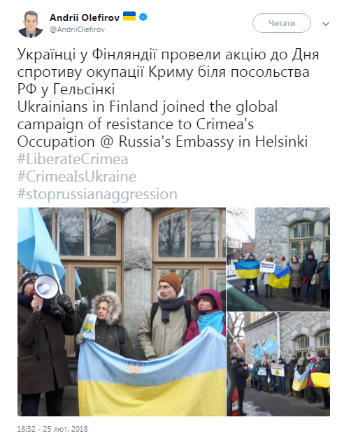 «Украинцы в Финляндии провели акцию ко Дню сопротивления оккупации Крыма у посольства РФ в Хельсинки», — говорится в сообщении дипломата.