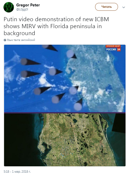 Как сообщает «Медуза», во время презентации Путина на экране был показан ролик, на котором боеголовки падают на территорию, похожую на Флориду.