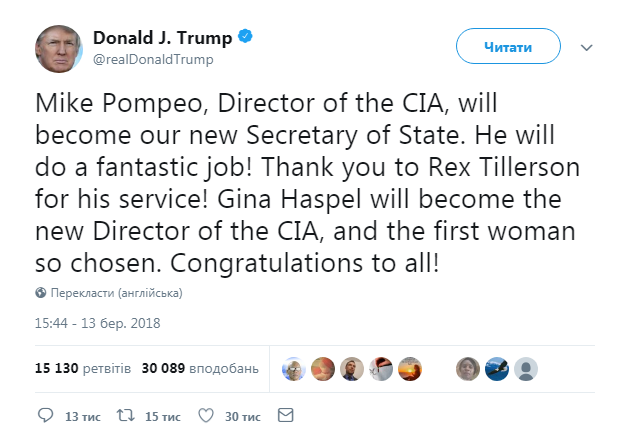 «Майк Помпео, директор ЦРУ, станет новым государственным секретарем. Он делает фантастическую работу. Спасибо Рексу Тиллерсону за его работу», — написал президент США.