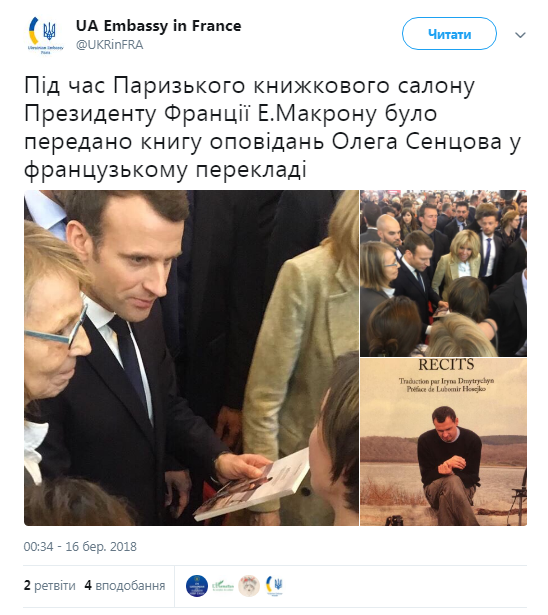 «Во время Парижского книжного салона Президенту Э. Макрону была передана книга рассказов Олега Сенцова во французском переводе», — говорится в сообщении.