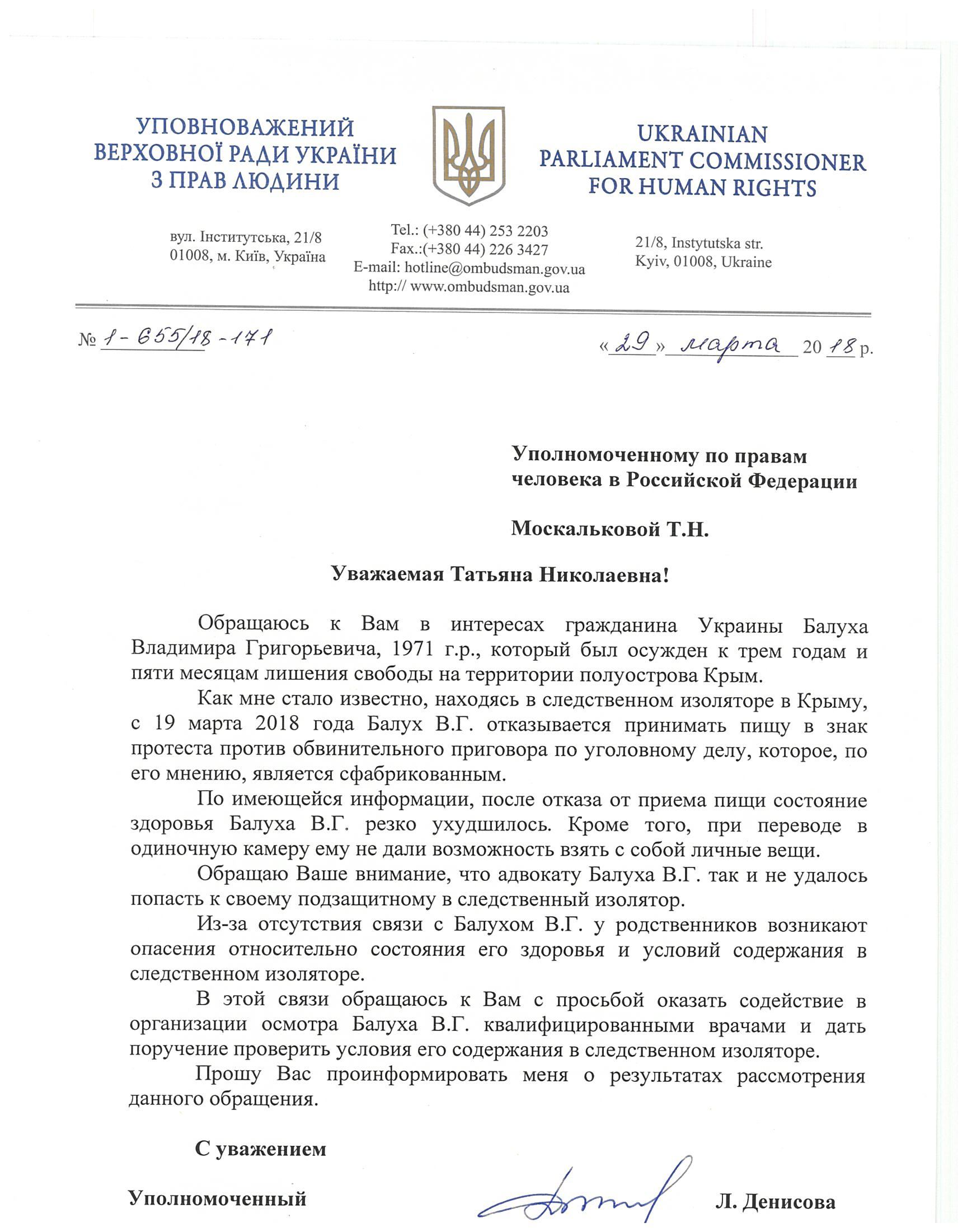 «Из-за отсутствия связи с Балухом В.Г. у родственников возникают опасения относительно состояния его здоровья и условий содержания в следственном изоляторе. Из-за этого обращаюсь к Вам с просьбой посодействовать в организации осмотра Балуха В.Г. квалифицированными врачами и дать поручение проверить условия его содержания в следственном изоляторе», — добавила Денисова.