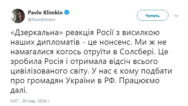 «Зеркальная» реакция России с высылкой наших дипломатов — это нонсенс. Мы же не пытались кого-либо отравить в Солсбери. Это сделала Россия и получила отпор всего цивилизованного мира. У нас есть кому позаботиться о гражданах Украины в РФ. Работаем дальше», — написал Климкин в своем Twitter.