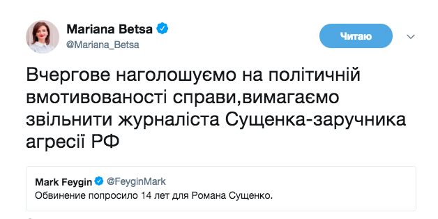 «В очередной раз отмечаем политическую мотивированность дела, требуем освободить журналиста Сущенко — заложника агрессии РФ», говорится в сообщении.
