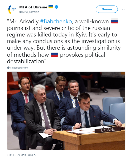 «Аркадий Бабченко, известный российский журналист и жесткий критик российского режима, сегодня погиб в Киеве. Рано делать какие-либо выводы, когда ведется расследование. Но есть поразительное сходство методов, как Россия провоцирует политическую дестабилизацию», — рассказал министр.