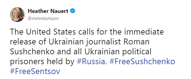 «Соединенные Штаты Америки требуют немедленного освобождения украинского журналиста Романа Сущенко и всех украинских политзаключенных, которые удерживаются Россией», — написала она.