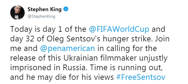 «Сегодня первый день чемпионата мира по футболу и 32-ой день голодовки Олега Сенцова. Присоединяйтесь ко мне и американскому ПЕН-центру с призывом освободить украинского режиссера, незаконно заключенного в России. Время уходит, он может умереть за свои взгляды», — написал Стивен Кинг.