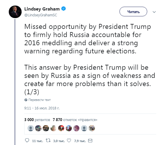 «Упущенна возможность президента Трампа твердо убедить Россию в ответственности за 2016 год вмешаться и дать серьезное предупреждение относительно будущих выборов. Этот ответ президента Трампа будет восприниматься Россией как признак слабости и создает гораздо больше проблем, чем решает… Наконец, если бы это был я, я бы проверял футбольный мяч для прослушивания устройств и никогда не допускал его в Белом доме», — пишет Грэм.