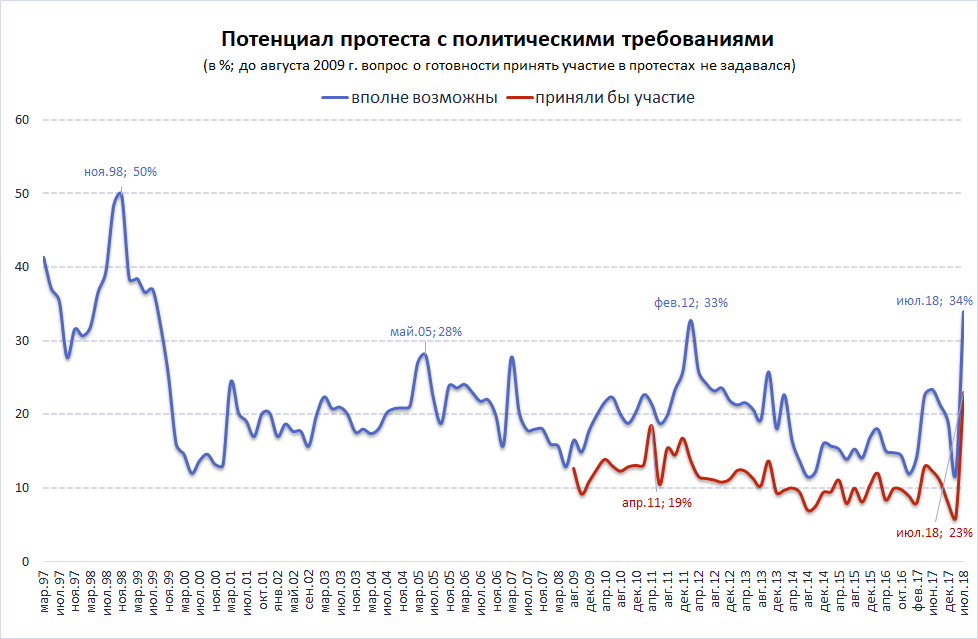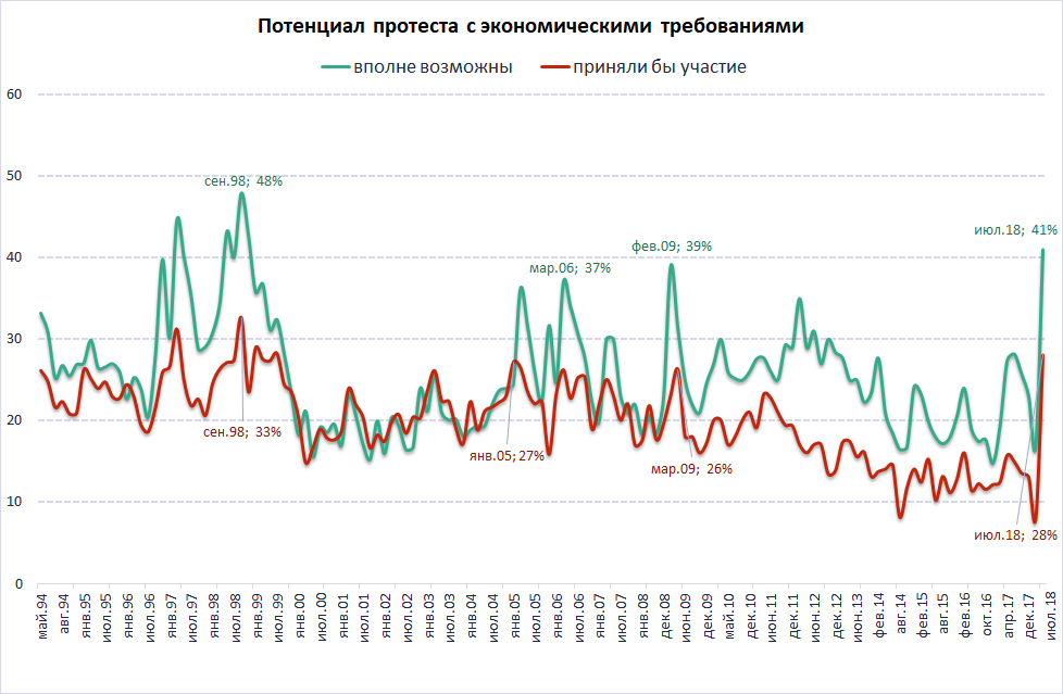 «В июле 2018 года – впервые с 2009 года – вероятность массовых протестов с экономическими требованиями в России в представлениях населения превысила 40-процентный порог (в феврале 2009 года возможность протестов против падения уровня жизни отмечали 39% опрошенных). Готовность принимать участие в таких протестах в настоящее время составляет 28%, что является максимальным значением в «посткрымский» период», — говорится в исследовании.