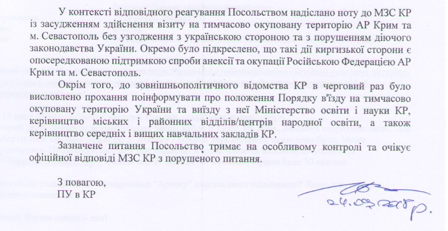 Нота связана с публикацией в киргизском издании, в котором говорится о визите «юных жителей Кыргызстана» во временно оккупированный Крым, передает «Громадське». Поездка была организована администрацией «Артека» совместно с Государственным институтом русского языка имени Пушкина (Москва).