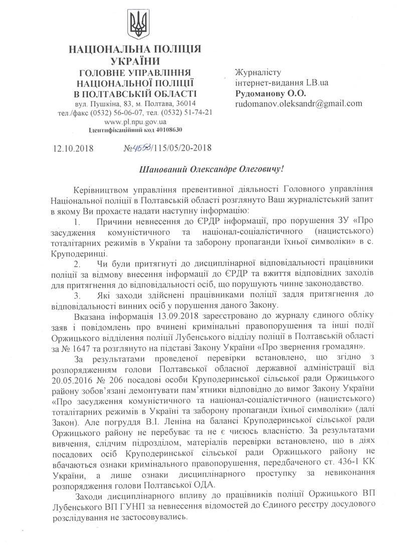Оржицкий отдел полиции в свою очередь заявил, что бюст Ленина в Круподеринцах не находится на балансе сельсовета и является бесхозным.