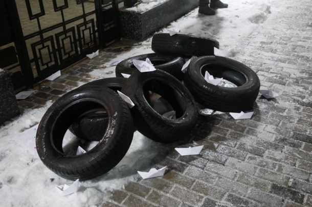 Участники акции (более 100 человек) принесли под российское посольство шины и бумажные кораблики.