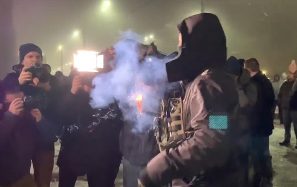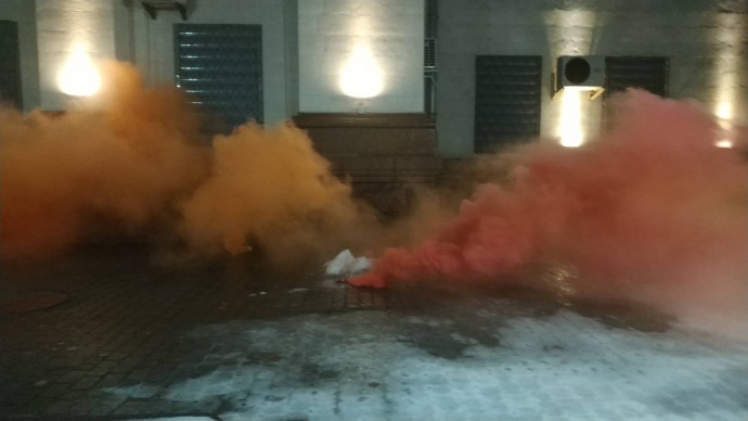 Со всех припаркованных во дворе посольства машин сняли номера. Около 23:30 неизвестные бросили в здание посольствоа файеры и дымовые шашки.
