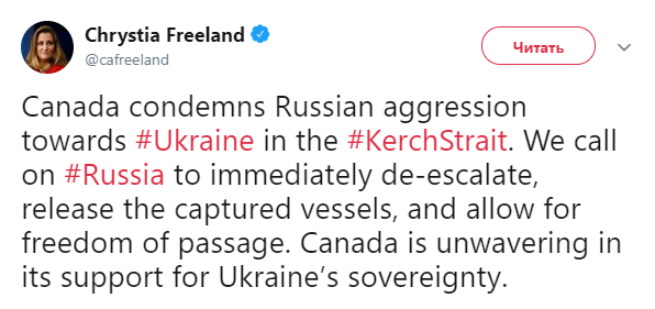 «Канада осуждает российскую агрессию в отношении Украины в Керченском проливе. Мы призываем Россию немедленно снизить (напряжение — ред.), освободить захваченные суда и обеспечить свободный проход. Канада неизменно поддерживает суверенитет Украины», — говорится в заявлении главы МИД Канады.