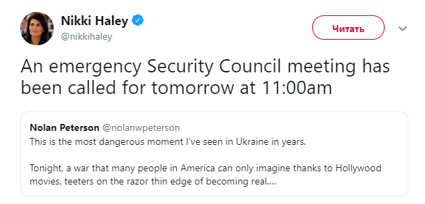 Об этом в своем Тwitter заявила постпред США в ООН Никки Хейли.