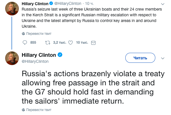«Захват Россией на прошлой неделе трех украинских кораблей и 24-х членов их экипажей в Керченском проливе - значительное военное обострение со стороны России в отношении Украины и очередная попытка России получить контроль над ключевыми зонами в самой Украине и вблизи нее. Действия России грубо нарушают соглашение, позволяющее свободный проход через пролив и G7 должна решительно требовать немедленного возвращения моряков», — заявила Клинтон.