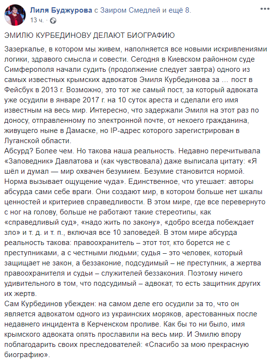 «Зазеркалье, в котором мы живем, наполняется все новыми искривлениями логики, здравого смысла и совести. Сегодня в «Киевском районном суде» Симферополя начали судить одного из самых известных крымских адвокатов Эмиля Курбединова за… пост в Facebook в 2013 г. Возможно, это тот же самый пост, за который адвоката уже осудили в январе 2017 г. на 10 суток ареста и сделали его имя известным на весь мир. Интересно, что задержали Эмиля на этот раз по доносу, отправленному по электронной почте, от некоего гражданина, живущего ныне в Дамаске, но IP-адрес которого зарегистрирован в Луганской области.