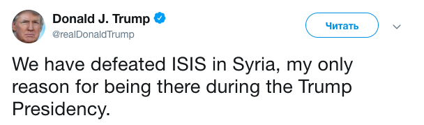 «Мы победили ИГИЛ в Сирии, мою единственную причину пребывания там в течение президентской каденции», — написал Трамп.
