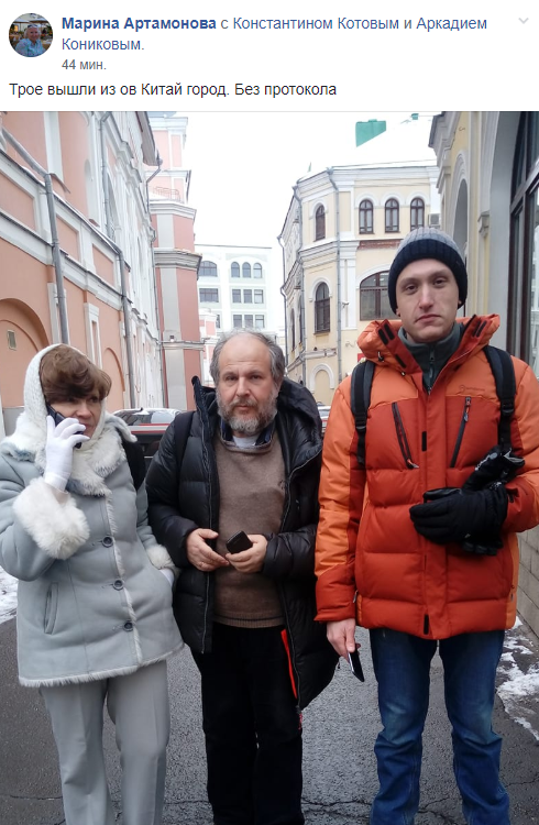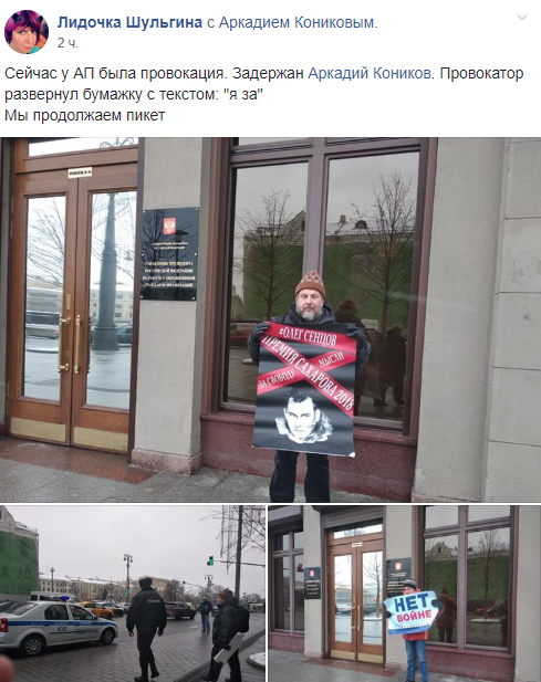 «Сейчас у АП была провокация. Задержан Аркадий Коников. Провокатор развернул бумажку с текстом: «я за». Мы продолжаем пикет!» — сообщают активисты.