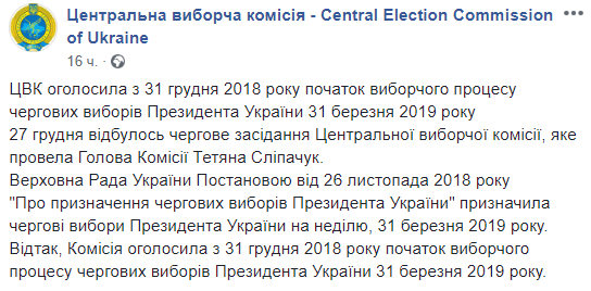 Центральная избирательная комиссия Украины назначила выборы президента на 31 марта 2019 года.