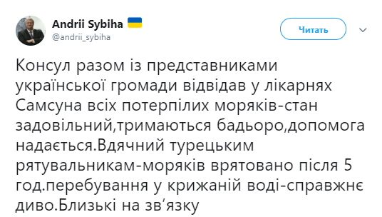 Консул вместе с представителями украинской общины посетил в больницах Самсуна всех пострадавших моряков-состояние удовлетворительное, держатся бодро, помощь предоставляется. Благодарен турецким спасателям, моряков спасли после 5-часового нахождения в ледяной воде — настоящее чудо. Для близких, затонувшего у Самсуна судна, информацию можно получить у Консула Бориса Ясинского, телефон горячей линии +905395509898», — сообщил посол.