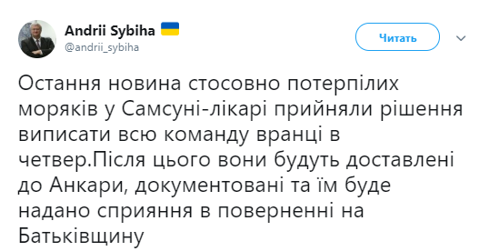 «В Самсуне врачи приняли решение выписать всю команду утром в четверг. После этого они будут доставлены в Анкару, им предоставят документы и будет оказано содействие в возвращении на Родину», — написал посол.