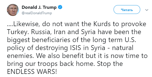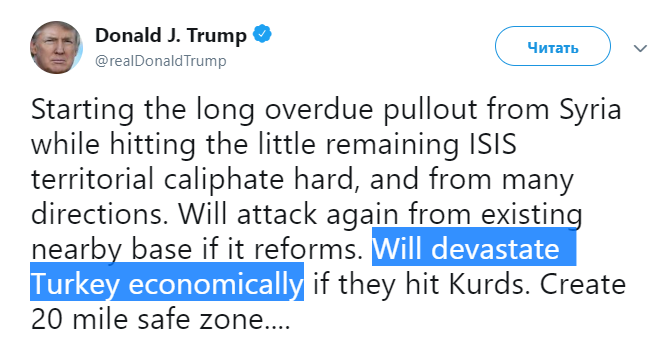 «Экономически разорим Турцию, если они атакуют курдов. Не хочется также, чтобы курды провоцировали Турцию. Россия, Иран и Сирия получили больше всего выгоды от долгосрочной американской политики по уничтожению ИГИЛ в Сирии. Мы также получали выгоду, но теперь пришло время вернуть наши войска домой. Остановить бесконечную войну!» — отметил американский президент.