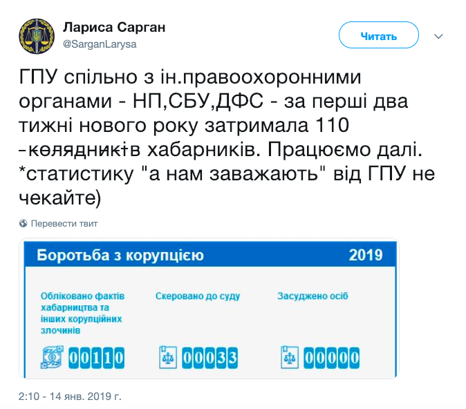 «ГПУ совместно с другими правоохранительными органами — Нацполицей, СБУ, ГФС — за первые две недели нового года задержала 110 взяточников», — говорится в сообщении.