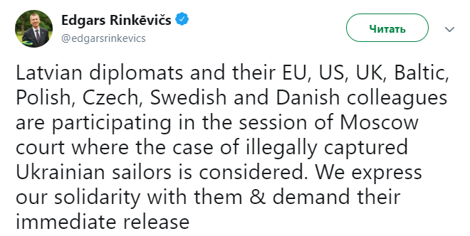 «Латвийские дипломаты и их коллеги из ЕС, США, Великобритании, Балтии, Польши, Чехии, Швеции и Дании участвуют в заседании московского суда, на котором рассматривается «дело» о незаконно захваченных украинских моряках. Мы выражаем свою солидарность с ними и требуем немедленного освобождения», — написал он.