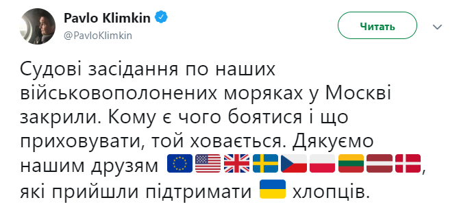 Министр иностранных дел Украины Павел Климкин в Twitter поблагодарил коллег, которые приехали на суд.