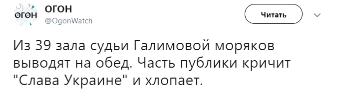 Там добавили, что во время того, как из зала суда выводили на обед некоторых моряков, часть присутствующих хлопали и кричали «Слава Украине!» и хлопали.