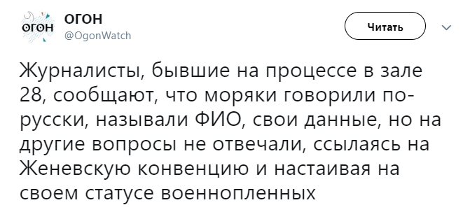 «Журналисты, бывшие на процессе в зале 28, сообщают, что моряки говорили по-русски, называли ФИО, свои данные, но на другие вопросы не отвечали, ссылаясь на Женевскую конвенцию и настаивая на своем статусе военнопленных», — говорится в сообщении.