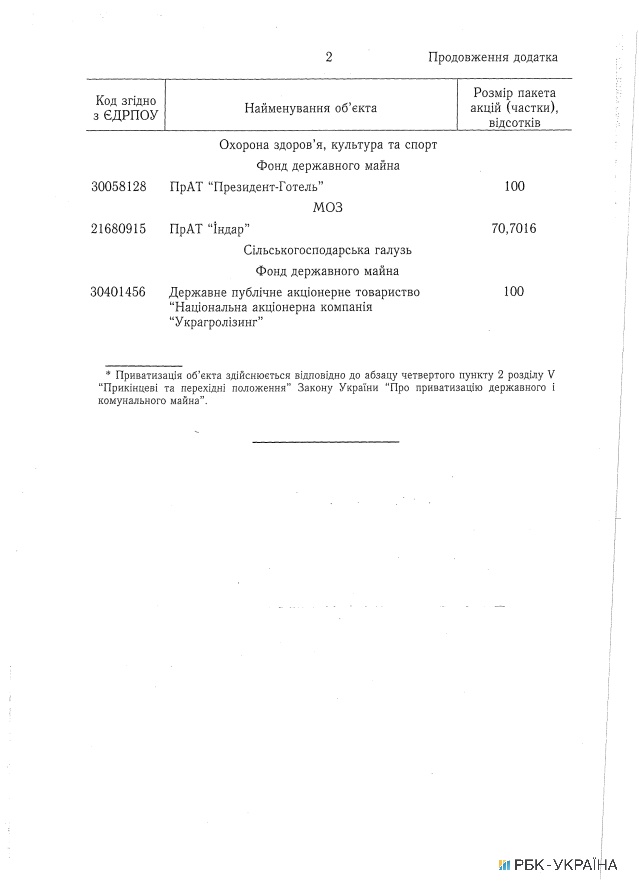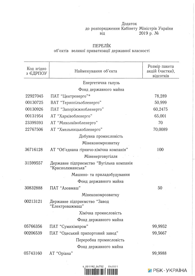 Согласно документу, опубликованному на сайте источника, из перечня объектов большой приватизации исключили «Завод алюминиевой фольги», «Аграрный фонд», Запорожский титано-магниевый комбинат, «Турбоатом», Херсонскую, Днепровскую и Северодонецкую ТЭЦ, а также Криворожскую теплоцентраль.