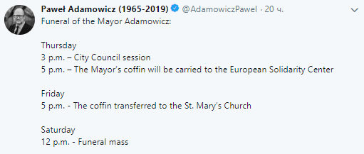 С мэром Гданьска Павлом Адамовичем, который скончался 14 января после нападения на него во время концерта, будут прощаться три дня.