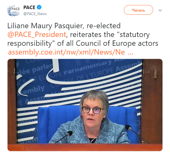 «Лилиан Мори-Паскье переизбрали президентом Парламентской ассамблеи Совета Европы», — говорится в сообщении.