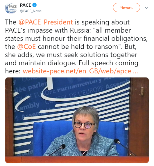 Об этом говорится в официальном сообщении ПАСЕ в микроблоге Twitter.