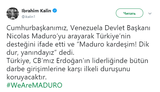 «Наш президент позвонил главе Венесуэлы Мадуро, выразил ему поддержку со стороны Турции и сказал: «Брат Мадуро, держись крепко, мы с тобой!» Турция под руководством своего лидера будет отстаивать свою принципиальную позицию против попыток переворотов», — написал он.