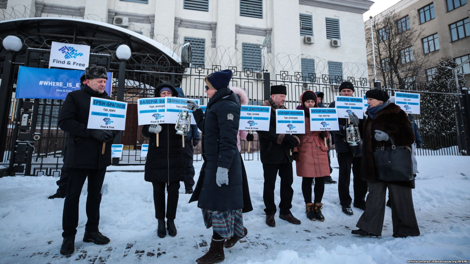 Участники акции пришли к посольству Российской Федерации в Киеве с плакатами, на которых написаны фамилии пропавших без вести и требования к властям РФ ответить на вопрос, где эти люди.
