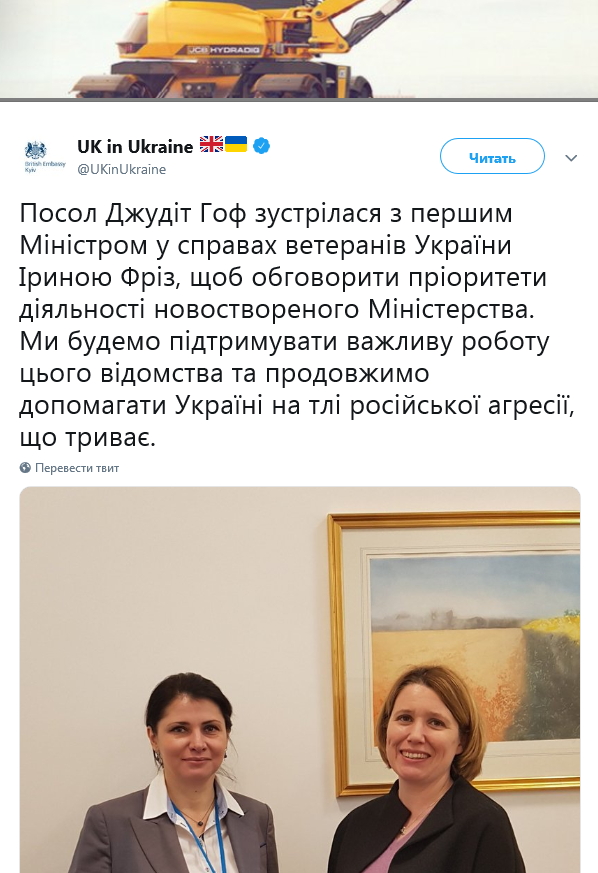 «Посол Джудит Гоф встретилась с первым министром по делам ветеранов Украины Ириной Фриз, чтобы обсудить приоритеты деятельности новосозданного Министерства. Мы будем поддерживать важную работу этого ведомства и продолжим помогать Украине на фоне продолжающейся российской агрессии», — отметили в посольстве.